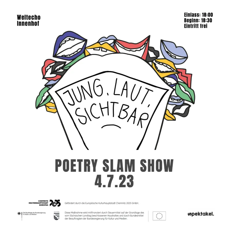 Poetry Slam ist das erfolgreichste Bühnenliteraturformat überhaupt und eine wunderbare Plattform, um sich Gehör zu verschaffen. Und weil die jungen Generationen viel zu sagen haben, fördert das Spektakel-Kollektiv im Rahmen der Kulturhauptstadt Poetry-Slam-Formate und -Workshops in und um Chemnitz, um den Nachwuchs eine Bühne zu bieten. Bei der Poetry Slam Show am 04.07.23 im Innenhof des Weltechos stehen junge Slammerinnen aus verschiedenen Regionen Sachsens auf der Bühne und präsentieren ihre Texte. Gemeinsam mit den erfahrenen Poetry Slammerinnen Birdy, Inke Sommerlang und Linux Wedemeyer wird es aber auch darum gehen, wie man mit dem Schreiben anfängt, wie man sich darin üben kann und wie sich der Weg auf die Poetry Slam Bühnen des gesamten Landes gestaltet. Ob jung oder jung geblieben, ob Schüler*in oder Lehrkraft, ob schreib- oder kulturbegeistert, alle sind herzlich eingeladen und dürfen sich auf einen Abend voller junger und kreativer Perspektiven freuen.