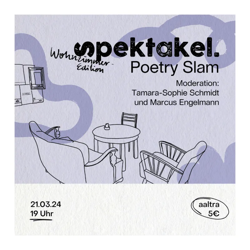 Der Spektakel Slam lädt in sein Wohnzimmer ein. Kommt zur ersten Ausgabe unseres neuen Slams in Chemnitz für neue und etablierte Poet*innen aus der Region! Moderiert von Tamara-Sophie Schmidt und Marcus Engelmann.